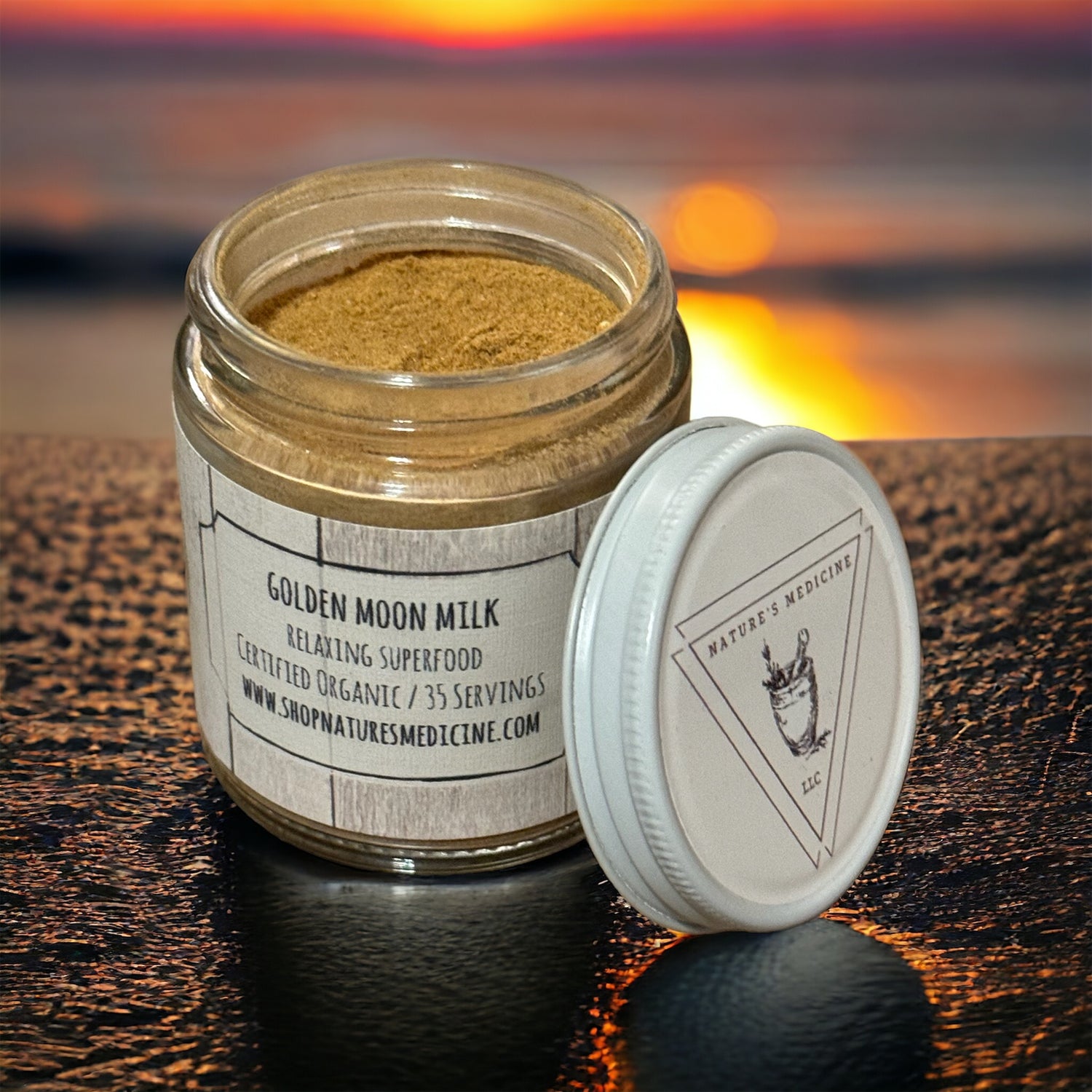 Our Golden Moon Milk is a smooth combination of Chai Indian spices with restorative and relaxing herbs to support the body and mind for a restful sleep. Inspired by a traditional Ayurvedic wellness ritual, golden milk, also known as haldi doodh is an ancient medicinal drink. Turmeric milk is known for its healing and anti-inflammatory properties.