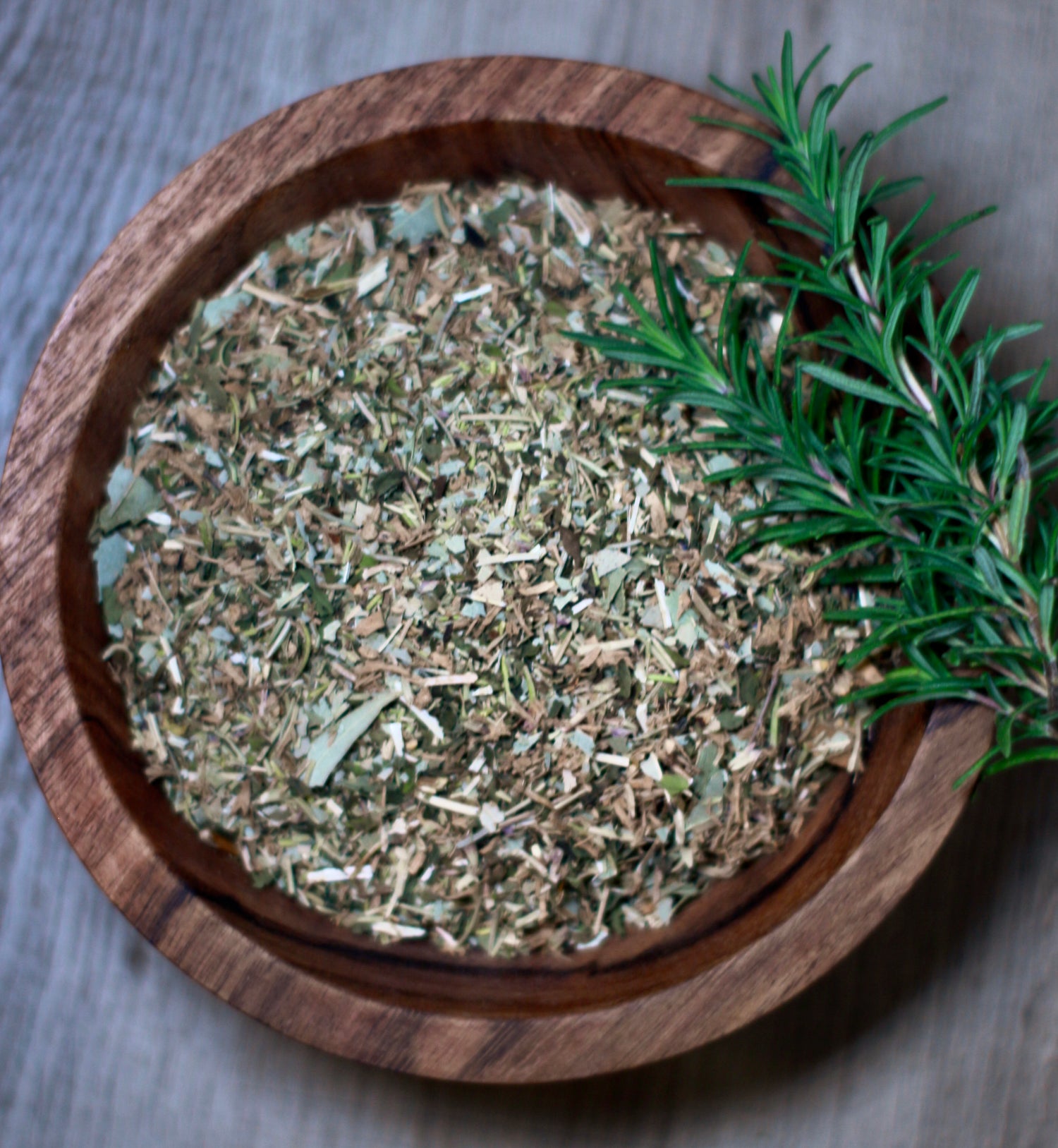 Ingredients: Rosemary leaves, Mint leaves, Eucalyptus, Hyssop, Reishi Mushrooms. All Ingredients are Certified Organic.