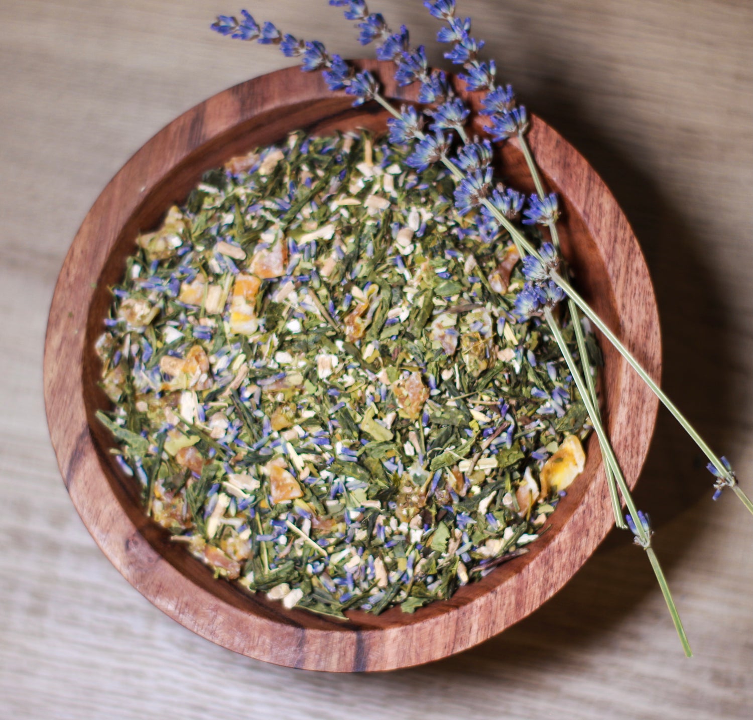 Ingredients: Sencha Green Tea, Lavender Flowers, Lemon Balm, Tangerine Slices, Ashwagandha, Yerba-Mate, Mint Leaves, Bergamot Essential Oil. All ingredients are certified organic.