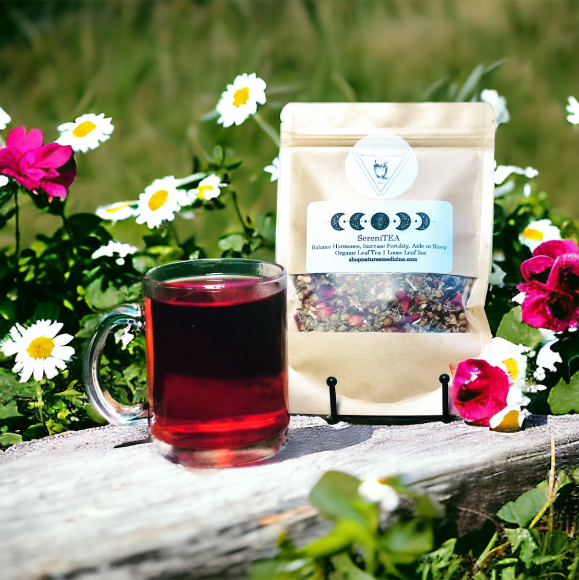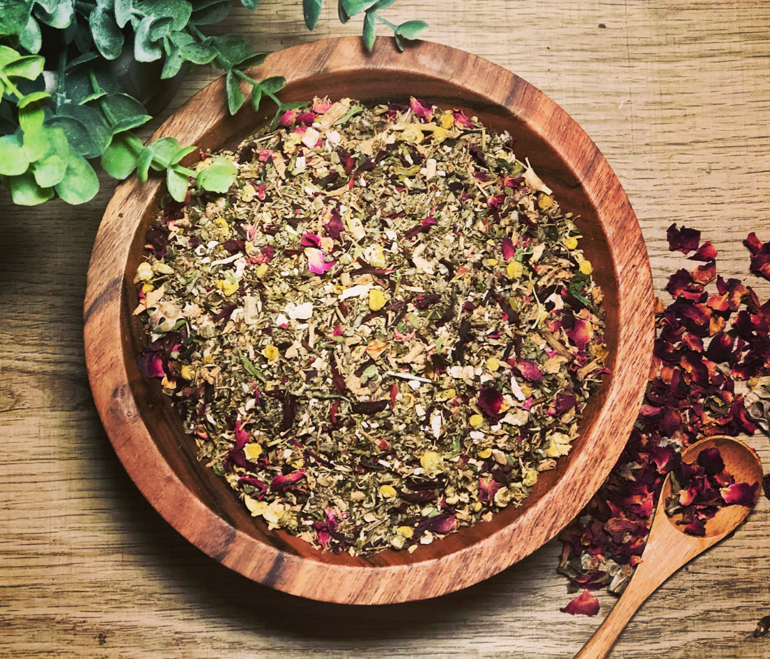 Ingredients: Rose petals, German Chamomile, Hibiscus, False Unicorn Root, Evening Primrose Oil, Ashwagandha, Lemon Balm, Common Sage, Papaya Leaf, Passionflower, Nettle, Peppermint leaves, Raspberry leaf, Scullcap, Vervain, Alfalfa leaf, Reishi Mushrooms, Peppermint Essential Oil.